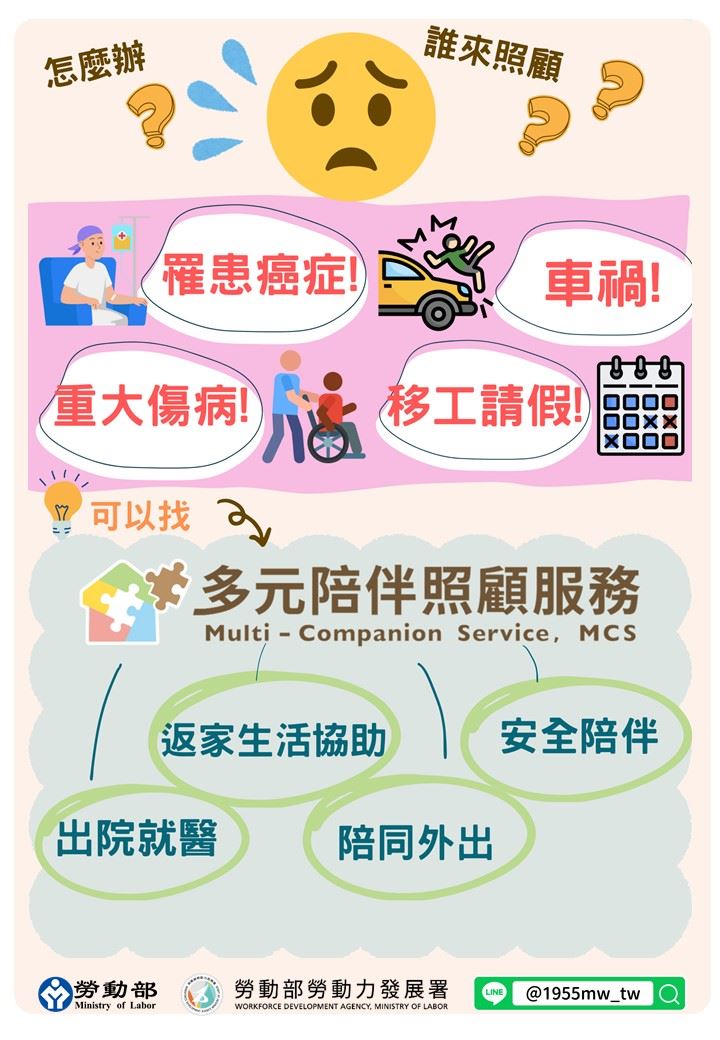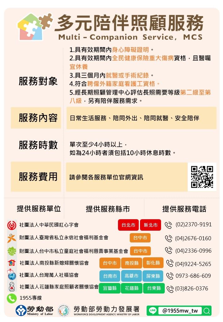 勞動部「多元陪伴照顧服務試辦計畫」在今(4/7)日正式上路,目前全國北、中、南、東共有6家公益團體提供服務,開放官網線上預約全額自費服務(https://mcs.wda.gov.tw/)。如果家中有突發狀況需要幫手陪伴照顧,可立即提出申請,期藉由提供彈性、多元服務使勞動者安心就業,不因照顧家人而退離職場。