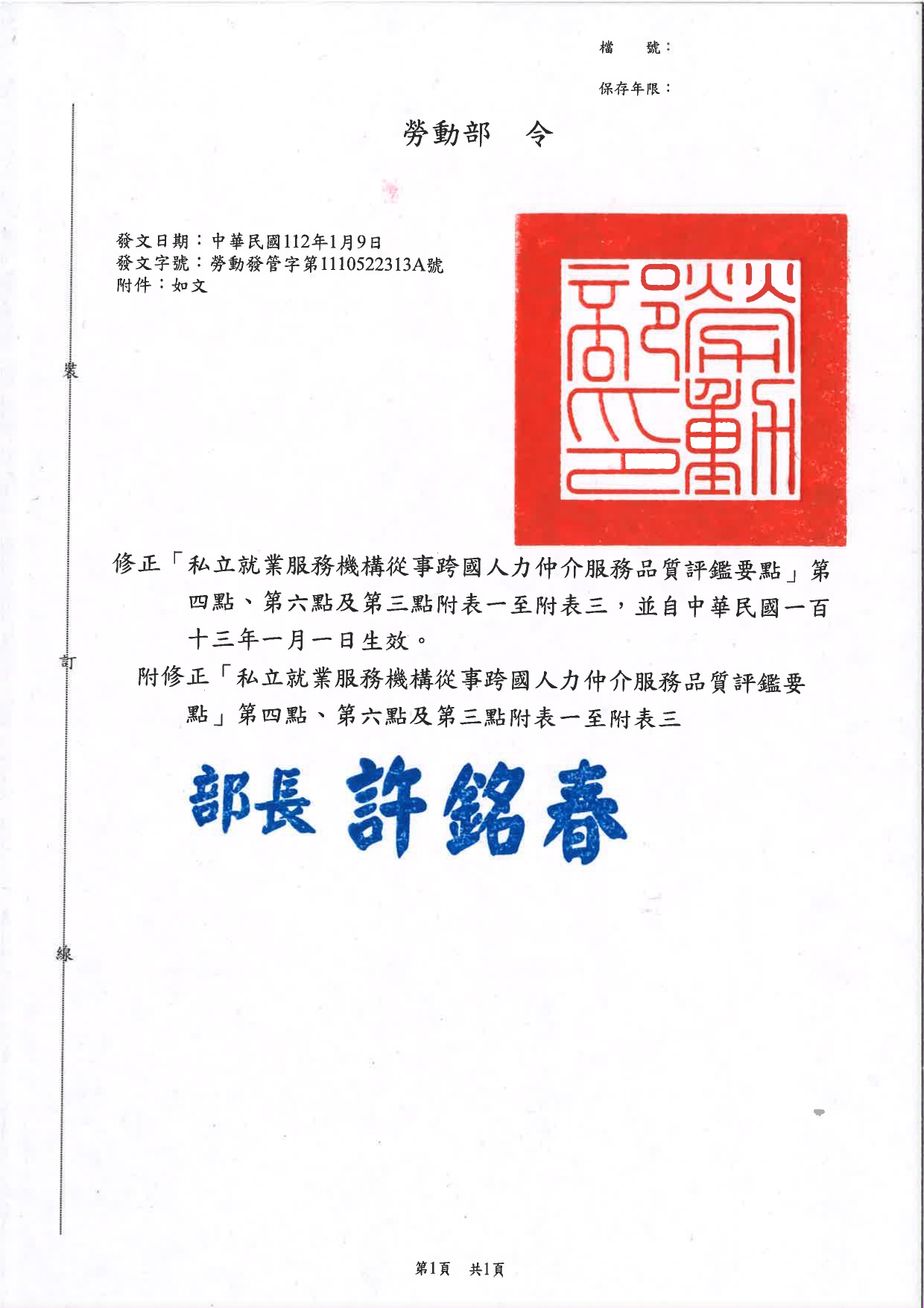 修正「私立就業服務機構從事跨國人力仲介服務品質評鑑要點」第四點、第六點、第三點附表一至附表三,並自中華民國一百十三年一月一日起生效。