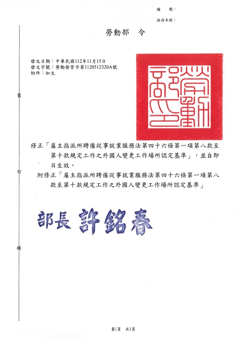 雇主指派所聘僱從事就業服務法第四十六條第一項第八款至第十款規定工作之外國人變更工作場所認定基準