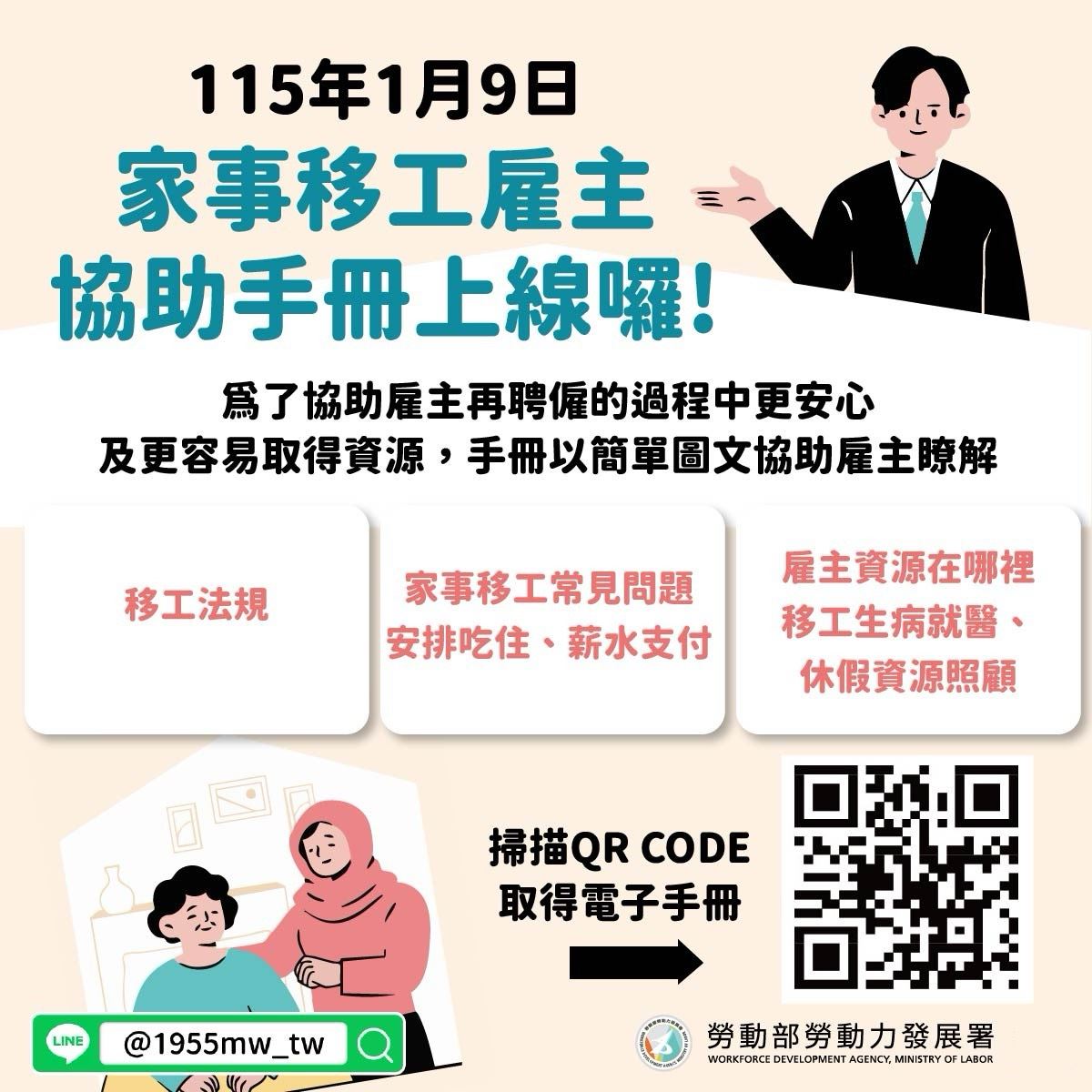 隨著臺灣社會邁入高齡化,家事移工已成為22萬個家庭不可或缺的照顧支柱。為解決家庭雇主常面臨的法規疑惑與管理痛點,勞動部勞動力發展署首度編印出版《家事移工雇主協助手冊》,透過淺顯易懂的圖解問答,整合從簽約、管理到資源銜接的全方位指引,幫助雇主與家事移工建立和諧勞雇關係。