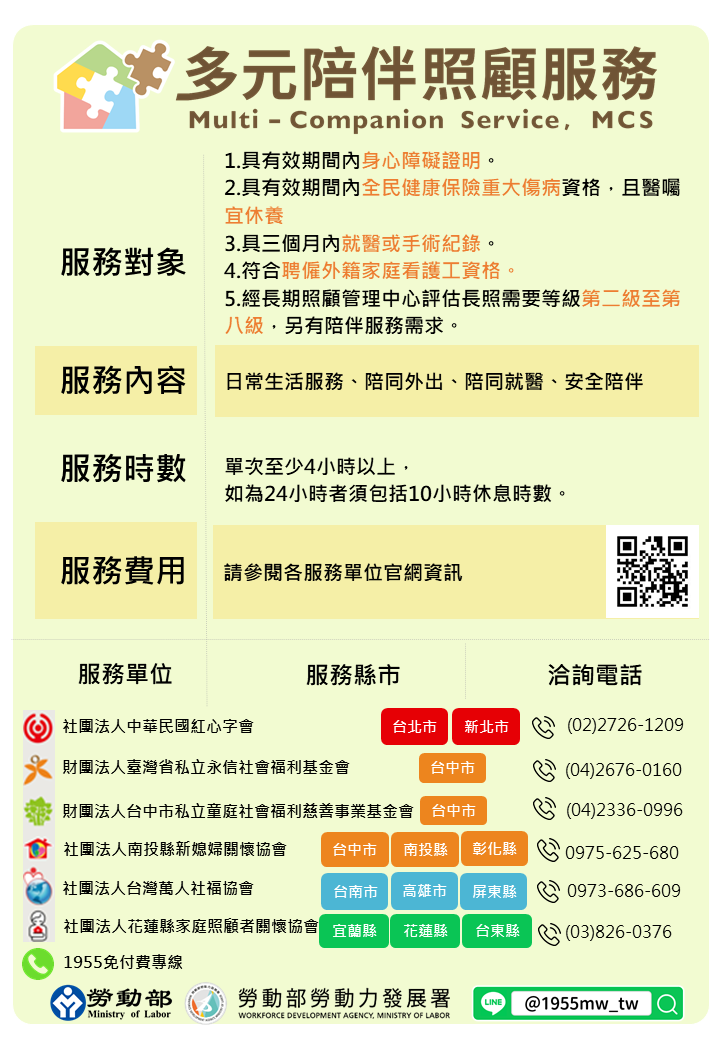 目前在全國北、中、南、東共有6家公益團體提供服務,並開放官網線上預約服務,如需申請服務,或欲了解相關資訊,請至多元陪伴照顧服務試辦計畫官網(https://mcs.wda.gov.tw)查詢,或洽1955免付費專線,由專人提供服務說明與協助。
