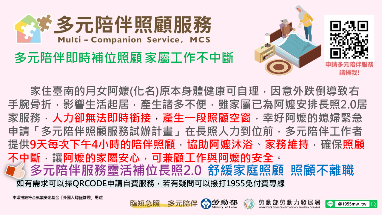 臺南的月女阿嬤(化名)原本身體健康可自理,但意外跌倒導致右手腕骨折手術住院,家屬幫阿嬤申請長照2.0居家服務,但等候長照服務到位前,子女因遠住外地無法馬上陪伴阿嬤、心急如焚。幸好媳婦緊急找到勞動部勞動力發展署「多元陪伴照顧服務試辦單位」,由專業陪伴工作者在空窗期短期協助阿嬤的生活起居,之後再銜接長照服務,家屬能在外地安心工作不用請假、離職。