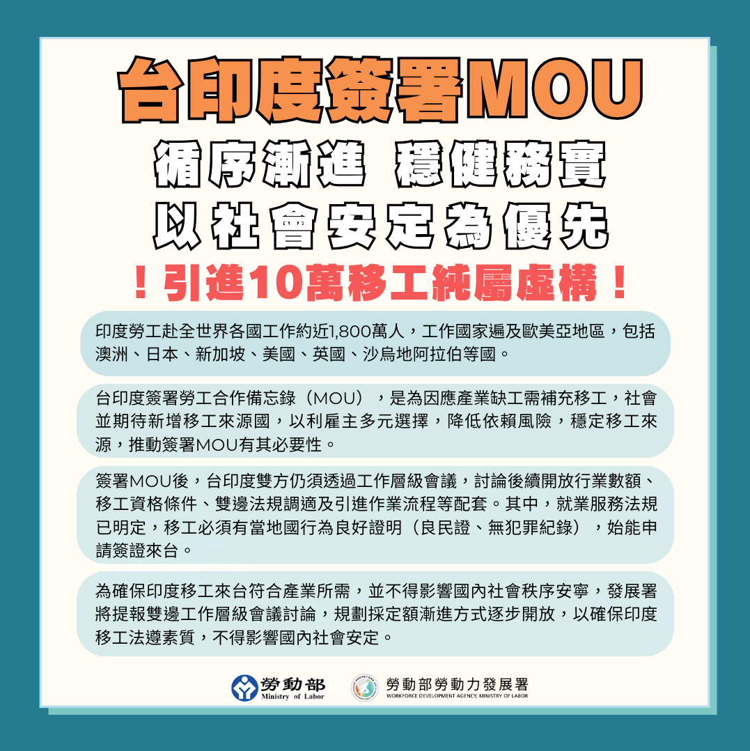 我國將與印度簽署勞務合作備忘錄(MOU),勞動部表示,引進印度移工是為因應產業缺工補充人力,積極回應各界期待新增移工來源國,以利雇主多元選擇,會循序按照我國規定引進,並無外電報導立即引進10萬印度移工之說。在落實社會安定及促進經濟發展前提下,將持續透過台印度雙方工作層級協商後續執行計畫,以確保勞工素質,不得影響社會安定,補充產業缺工需求。