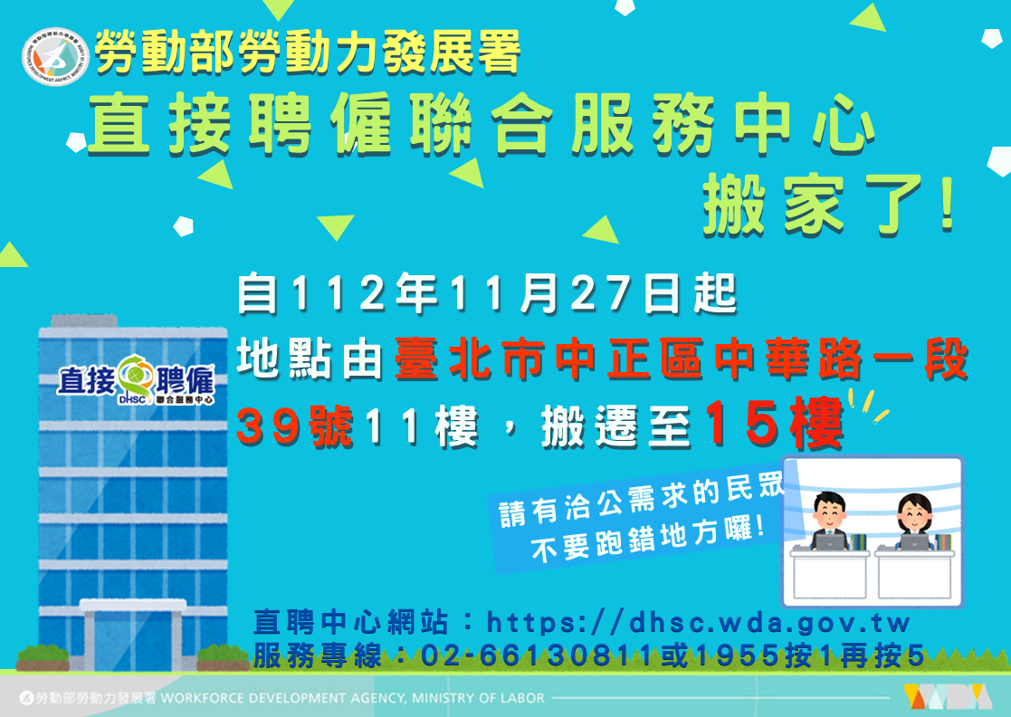 直接聘僱聯合服務中心自112年11月27日起搬遷新址,持續提供多元服務不打烊!
