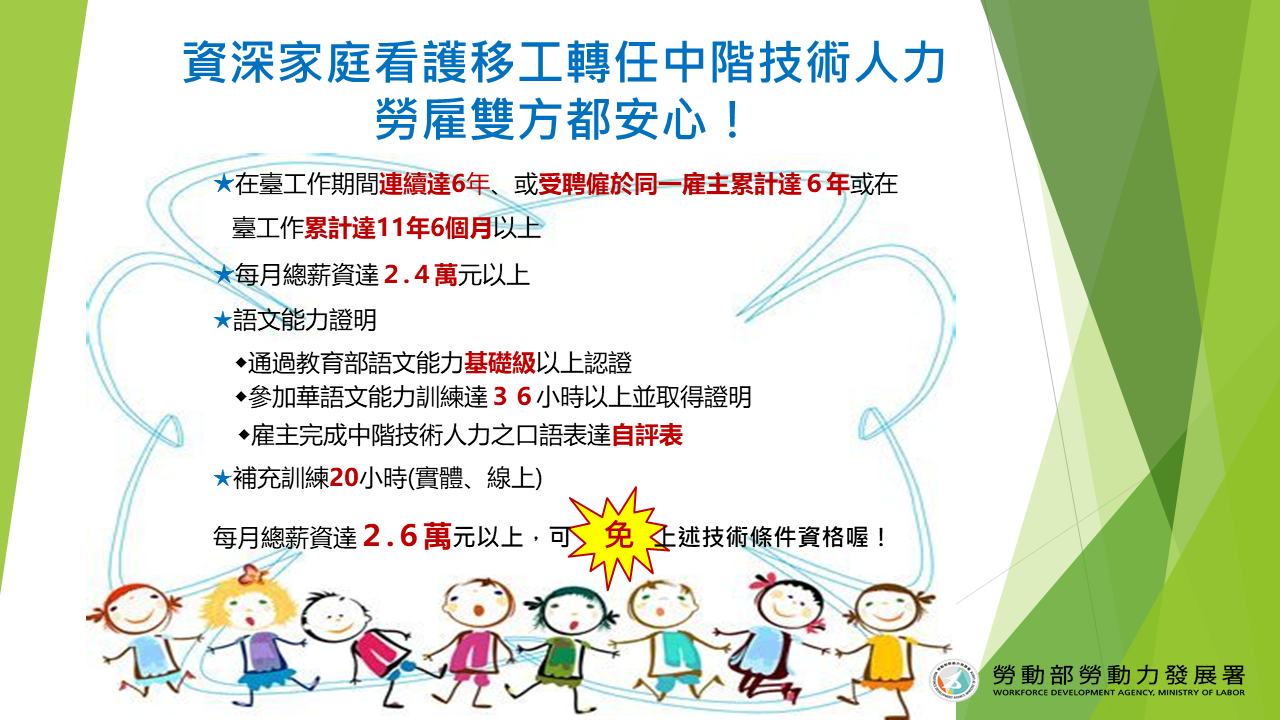 勞動部說明,雇主聘僱資深移工轉任中階技術家庭看護工,在臺工作期間只要連續達6年、或受聘僱於同一雇主累計達6年,或受聘僱於不同雇主所累計工作年資達11年6個月以上,每月總薪資達新臺幣2萬4,000元,具國(閩南)語文能力認定資格及接受20小時補充訓練;或每月總薪資達新臺幣2萬6,000元以上,就可由雇主申請轉任為中階技術家庭看護工,照顧家中的失能者。