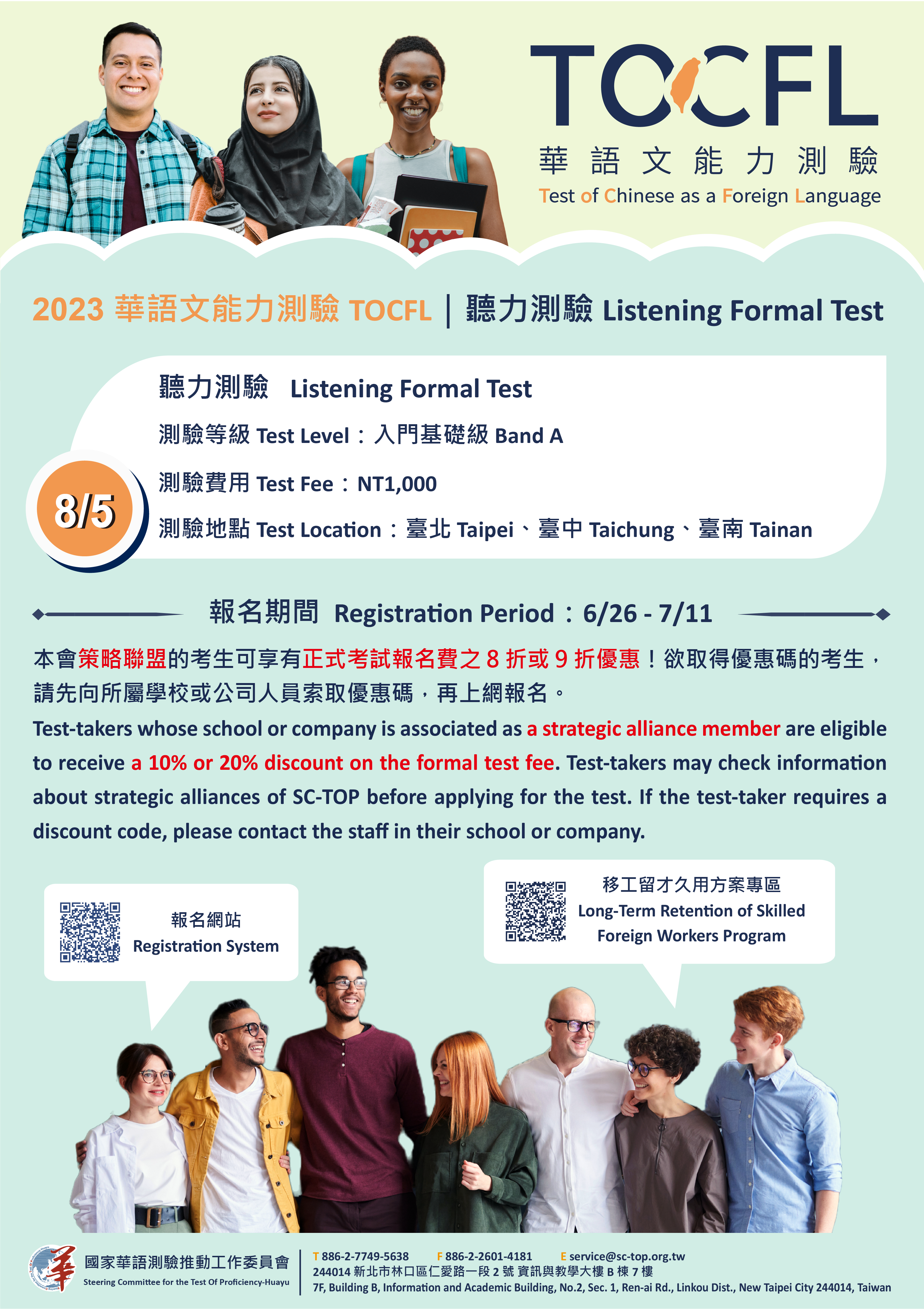 為配合「移工留才久用方案」,華測會於112年8月5日(星期六)增辦華語文能力「聽力測驗入門基礎級」測驗場次,考試地點共計有:國立台灣大學、國立中興大學與嘉南藥理大學等3處考試中心。