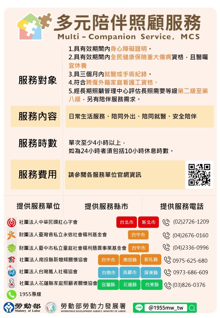 目前在全國北、中、南、東共有6家公益團體提供服務,並開放官網線上預約服務,如需申請服務,或欲了解相關資訊,請至多元陪伴照顧服務試辦計畫官網(https://mcs.wda.gov.tw)查詢,或洽1955免付費專線,由專人提供服務說明與協助。