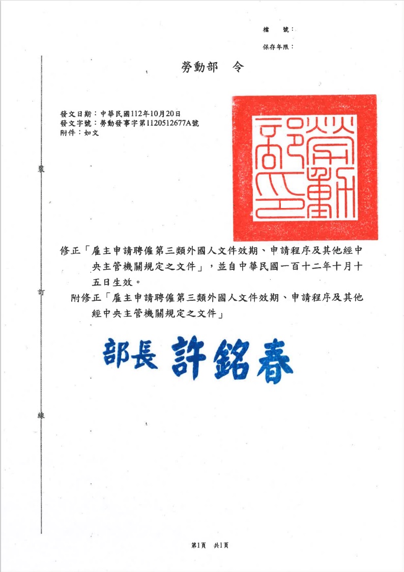 附修正「雇主申請聘僱第三類外國人文件效期、申請程序及其他經中央主管機關規定之文件」