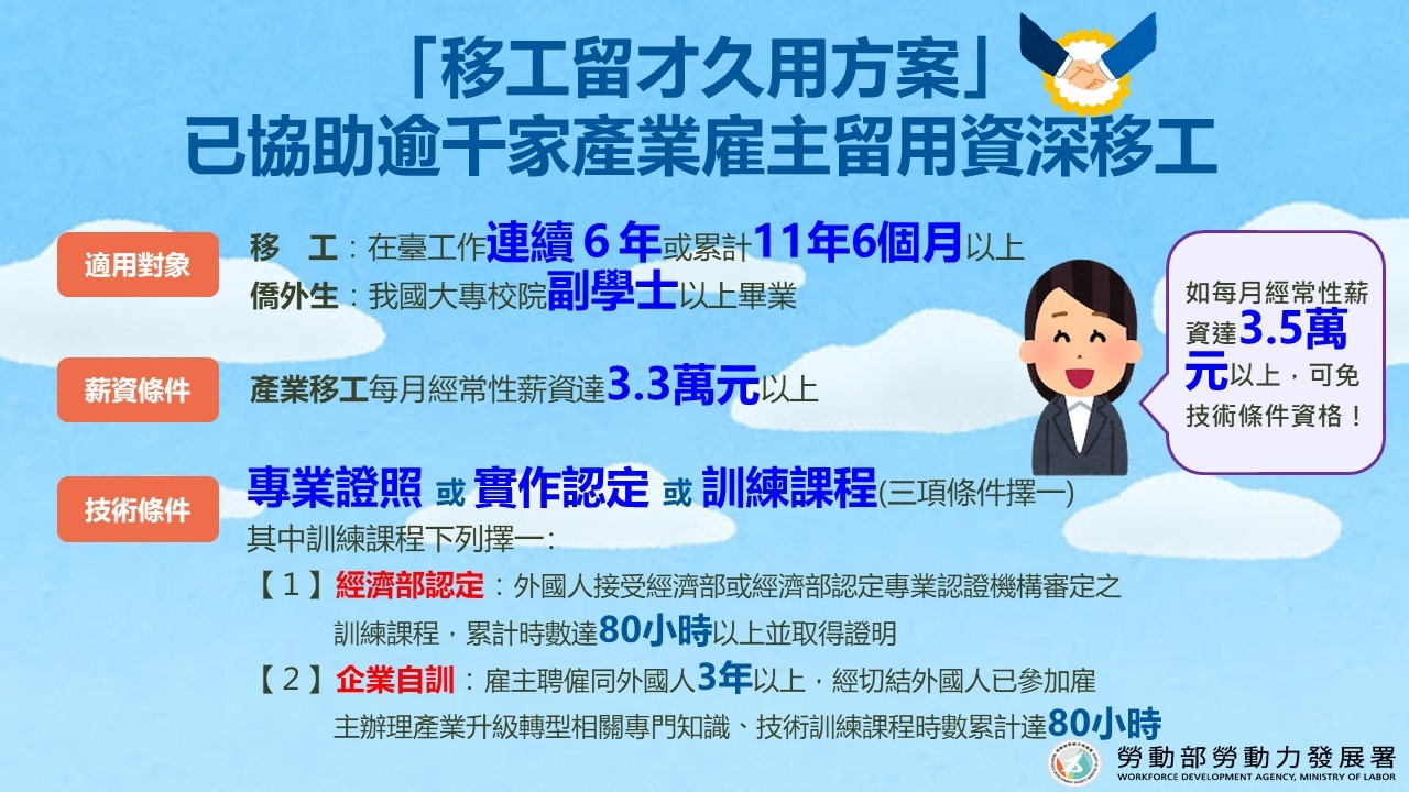 勞動部進一步說明,為積極協助產業類雇主留用優秀資深移工,勞動部已於112年3月15日再修法新增中階技術屠宰工作,使屠宰業雇主得以留用資深移工轉任中階技術人力;另外也放寬製造業及屠宰業企業自辦訓練課程增列為技術資格之一,製造業及屠宰業雇主聘僱同一移工達3年以上,參加雇主自辦產業升級轉型相關專門知識、技術訓練課程達80小時以上,就可符合技術條件資格。