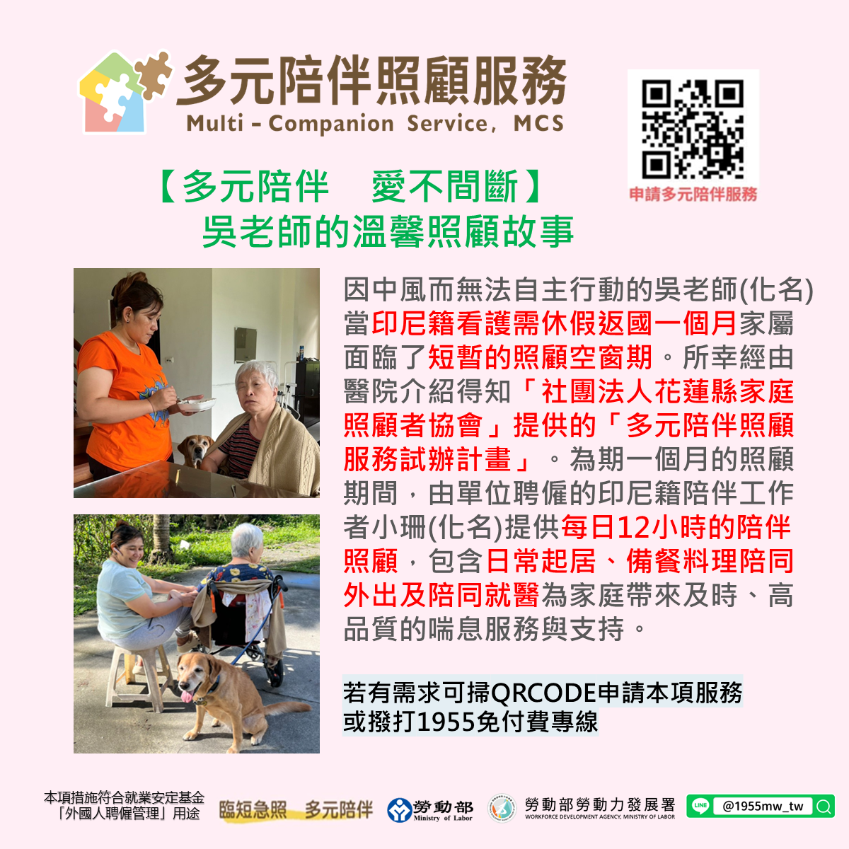 家住花蓮且已退休的吳老師(化名)3年前中風,現今行動需人幫忙,而當吳老師長期信任的印尼籍看護需返國休假1個月,家屬在憂心照顧空窗期之時,經由醫院個管師介紹,得知由勞動部所推動的「多元陪伴照顧服務試辦計畫」,在與試辦單位「社團法人花蓮縣家庭照顧者協會」接洽後,由單位提供的陪伴照顧服務為吳老師一家帶來及時、高品質的喘息服務與支持。