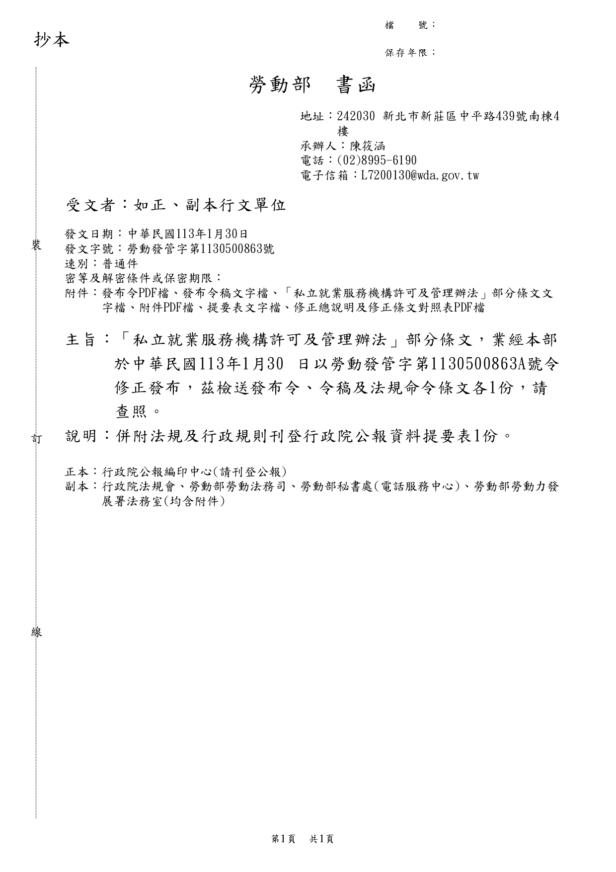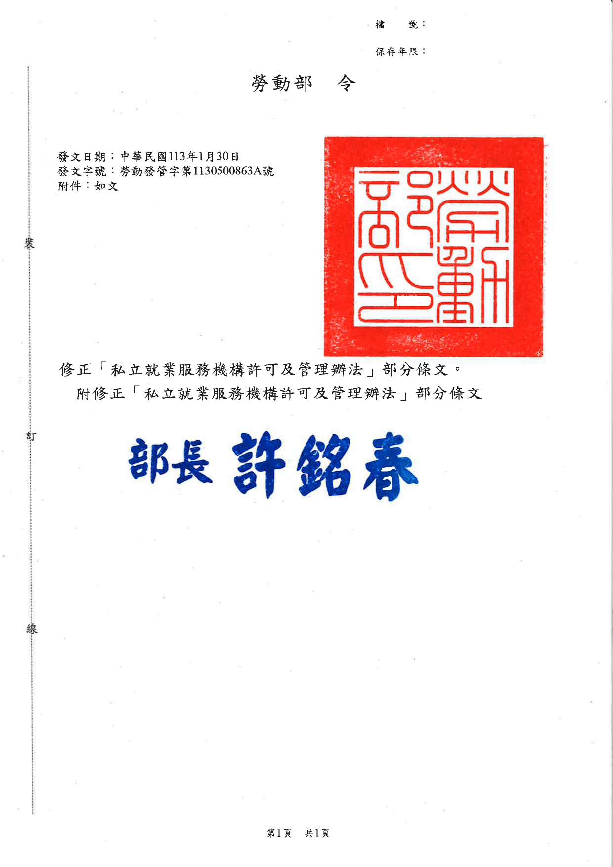 修正「私立就業服務機構許可及管理辦法」部分條文
