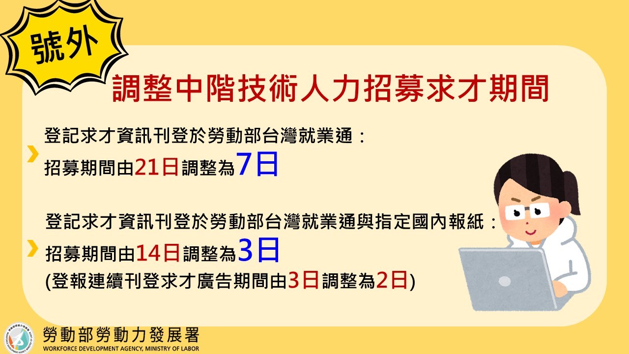 勞動部進一步說明,為積極協助產業類雇主留用優秀資深移工,勞動部已採行許多簡化措施,調整縮短辦理中階技術人力國內求才招募的期間,以利雇主加速取得聘僱許可。目前已經核准逾千家產業類雇主聘僱中階技術人力,勞動部呼籲符合申請條件的產業類雇主積極提出申請,為企業的長期發展提供穩固優質的勞動力,創造雇主與移工雙贏的局面,進而提升我國整體產業及經濟發展的競爭力。