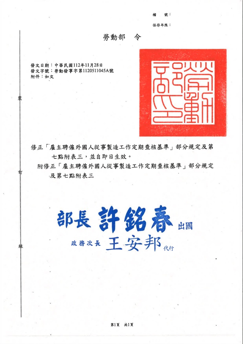 修正「雇主聘僱外國人從事製造工作定期查核基準」部分規定及第七點附表三,並自即日生效