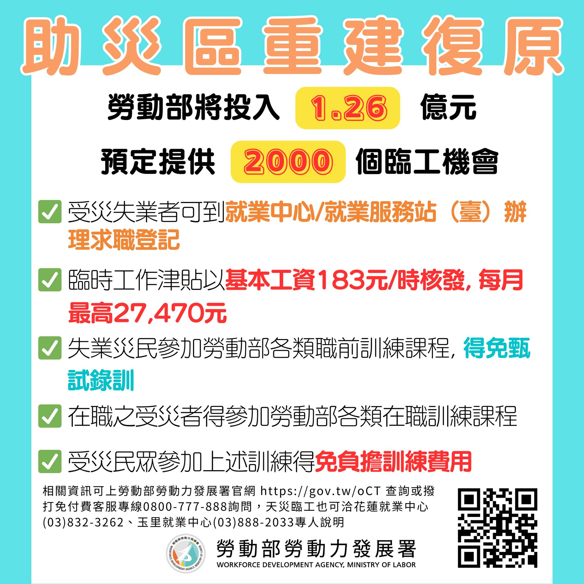 👉相關資訊可上勞動部勞動力發展署官網 https://gov.tw/oCT 查詢,或撥打免付費客服專線0800-777-888詢問,天災臨工也可洽花蓮就業中心(03)832-3262、玉里就業中心(03)888-2033專人說明