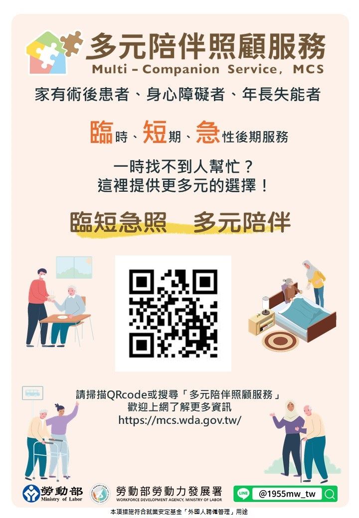 勞動部「多元陪伴照顧服務試辦計畫」在今(4/7)日正式上路,目前全國北、中、南、東共有6家公益團體提供服務,開放官網線上預約全額自費服務(https://mcs.wda.gov.tw/)。如果家中有突發狀況需要幫手陪伴照顧,可立即提出申請,期藉由提供彈性、多元服務使勞動者安心就業,不因照顧家人而退離職場。