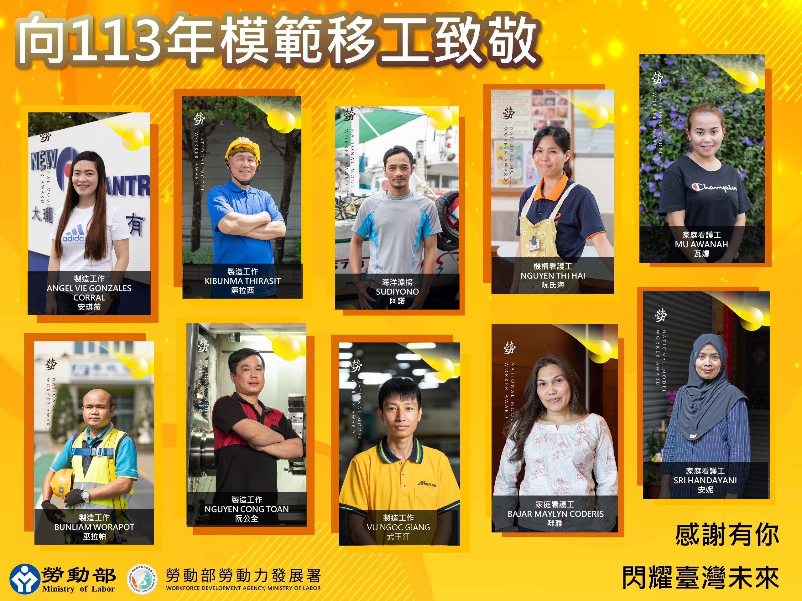 本次模範移工代表是越南籍NGUYEN THI HAI(阮氏海),她在花蓮縣吉豐老人養護所服務已達13年,擁有豐富的看護經驗,給予住民舒適的照顧,是不可或缺的優良照護員。在新進移工的指導上,更是不厭其煩地耐心引導,幫助他們融入新環境。她和善且充滿熱情的工作態度,讓雇主及機構內住民都非常讚賞。另外,菲律賓籍的ANGEL VIE GONZALES CORRA已在產線工作6年以上並擔任產線幹部,專業能力優秀,擁有15張技能證照,協助提升產能效率,也協助培育外籍新員工,熱心分享自身經驗,對公司發展及專業傳承有很大貢獻。而來自印尼的SRI HANDAYANI精通國語與臺語,來臺從事家庭照顧工作已經11年,照顧長輩如同親人般相處,不但同理陪伴長輩,也細心掌握照護長輩的技巧,連醫院的護理師都讚譽有佳。而其他模範移工,不論來自菲律賓、泰國、印尼或是越南,來臺工作都已超過6年以上,並且在製造業、屠宰業、漁撈工作、家庭看護等工作領域,展現認真又積極的工作態度,不但在工作主動學習、提升自我能力,更是雇主不可或缺的得力助手,並協助指導其他移工。