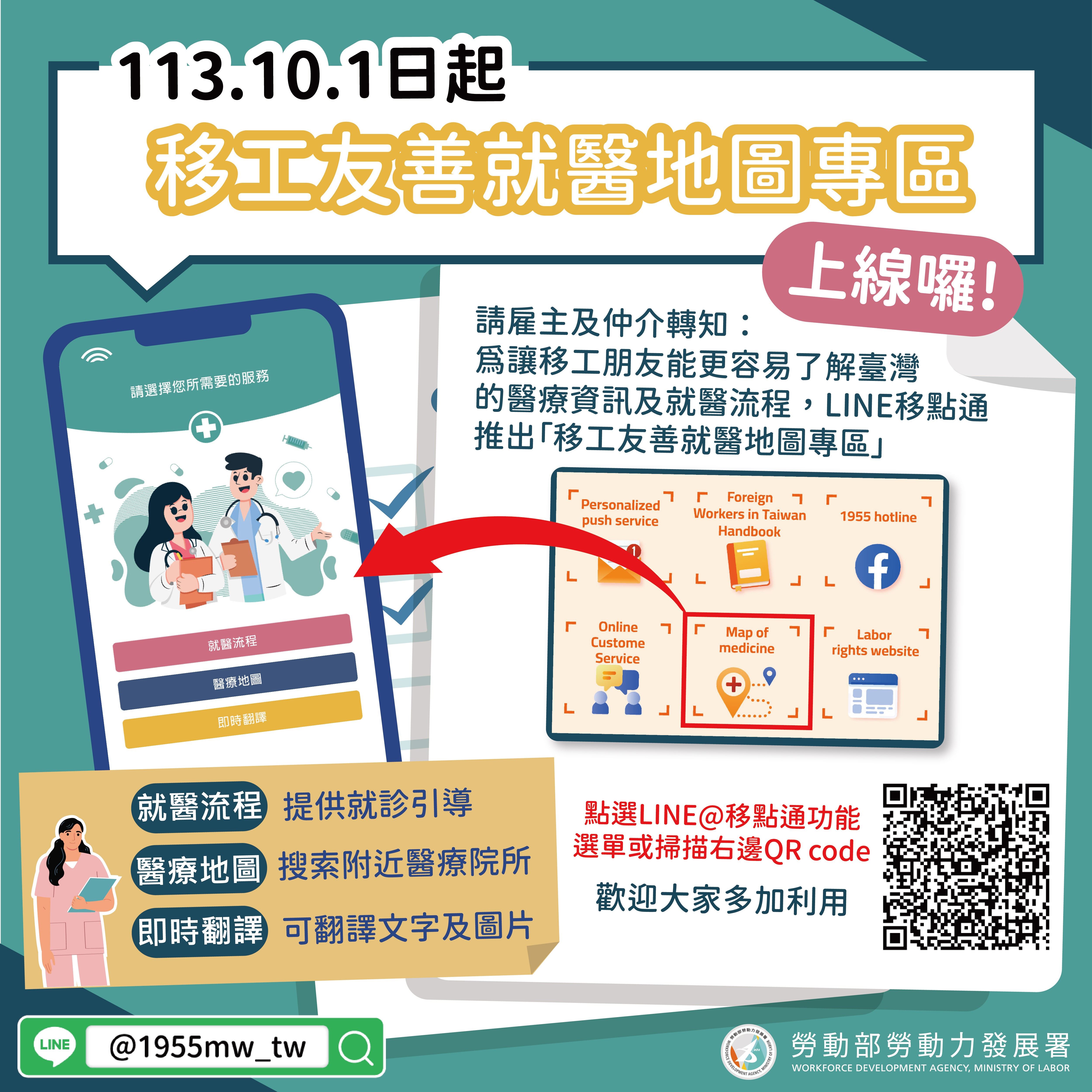 勞動部勞動力發展署為提升在臺工作移工的生活品質與醫療便利性,於113年10月1日正式推出「友善移工就醫地圖專區」,移工在LINE@移點通點選「就醫地圖」就能更便捷地取得就醫資訊尋求醫療服務,提供清晰、易操作的就醫指引、語言翻譯及即時支援服務,有效解決就醫語言障礙問題。